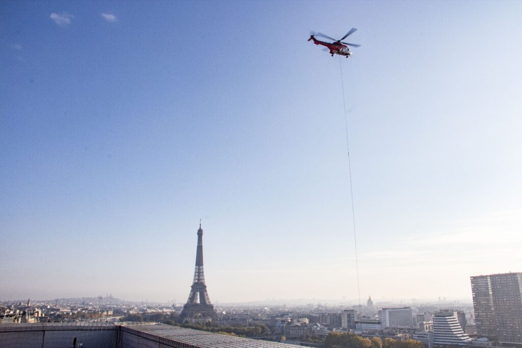 Pour cette intervention délicate, l’accès au toit ne permettant pas l’usage d’une grue classique, le levage a été réalisé à l’aide d’un hélicoptère spécialisé.